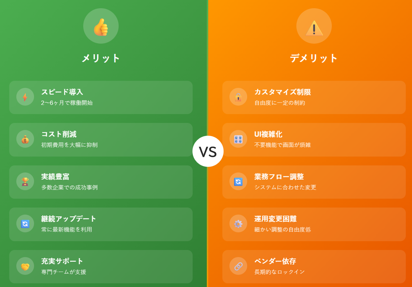 継続的なアップデート:ベンダーが継続的に機能改善やセキュリティアップデートを行うため、常に最新の機能を利用できます。これは個別開発では難しい大きなメリットといえるでしょう。