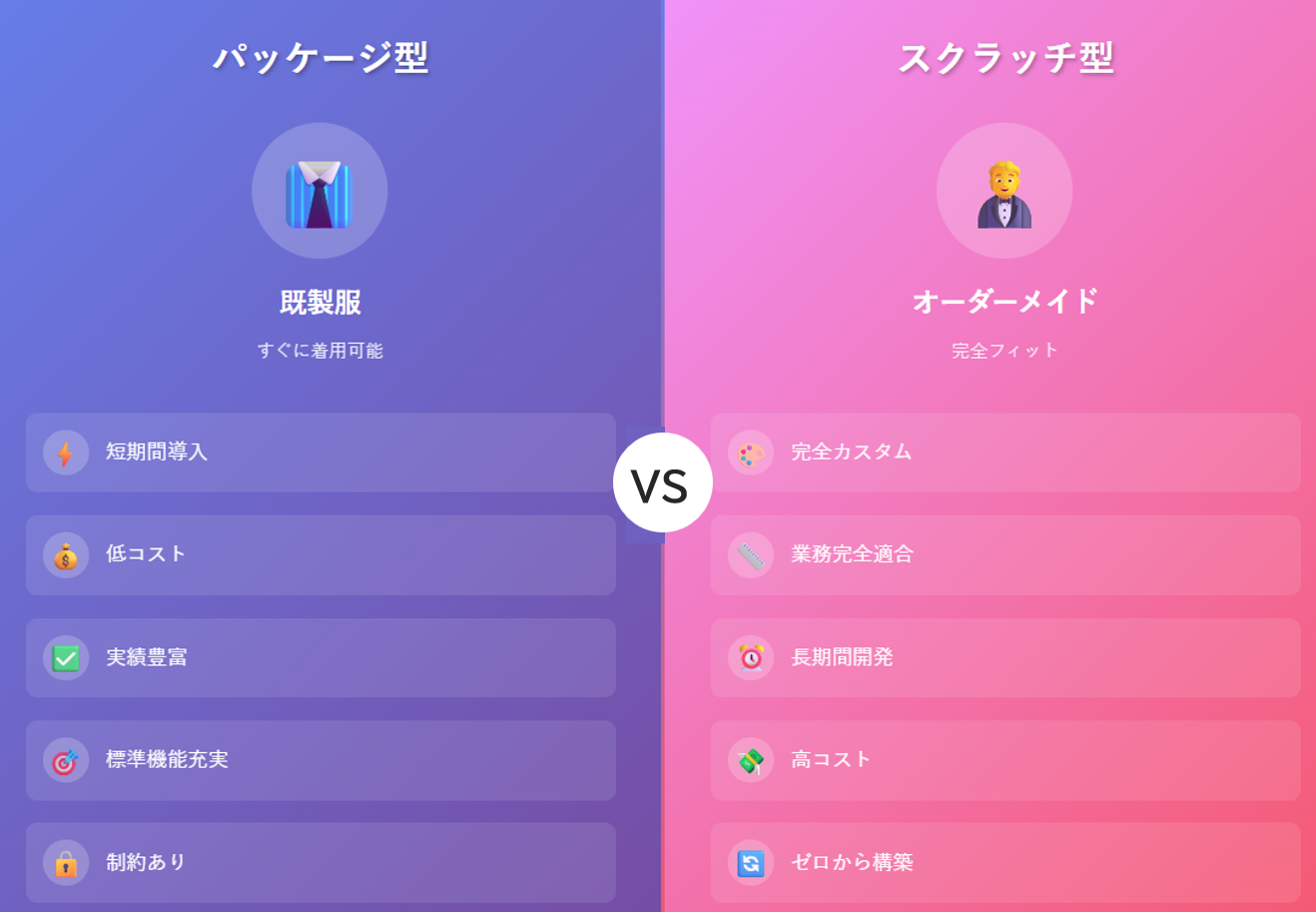 両者の違いを衣服に例えると、パッケージ型は「既製服」、スクラッチ型は「オーダーメイドスーツ」のような関係です。オーダーメイドスーツは完全に体型に合いますが、時間とコストがかかります。一方、既製服は標準的なサイズで作られているため、多くの人にある程度フィットし、すぐに着用できて価格も手頃です。