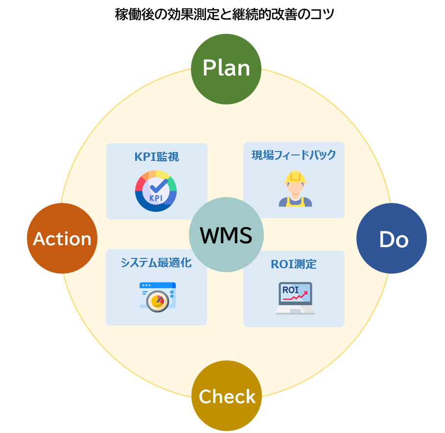 WMS稼働後は、設定したKPIを定期的にモニタリングし、目標達成度を評価します。単に数値を測定するだけでなく、改善が見られない場合の原因分析も重要です。