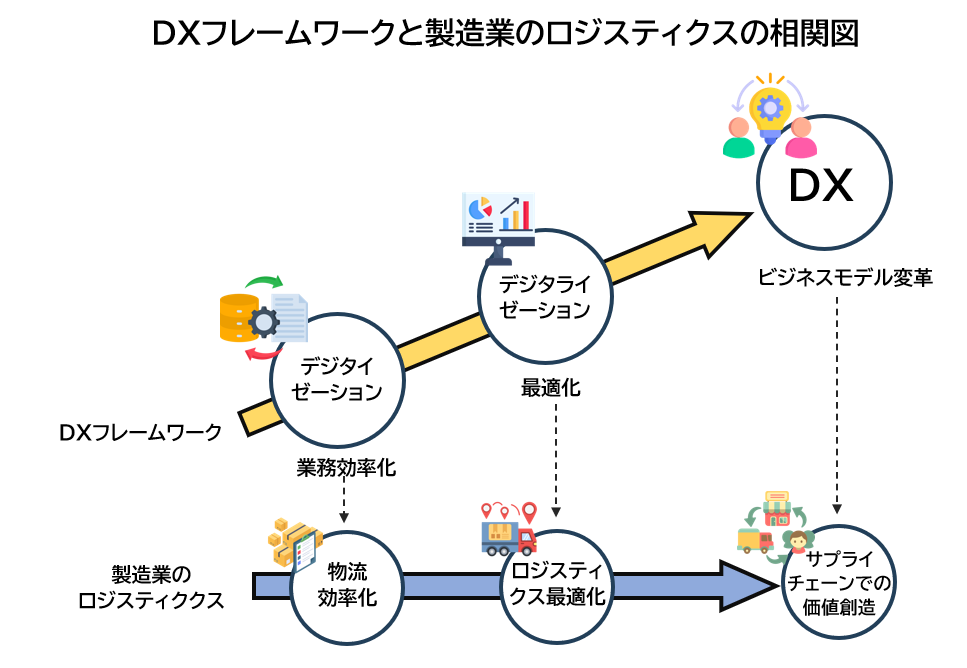 製造業においては、この3つの概念を階層的に理解し、段階的にレベルアップを図ることが重要です。経済産業省のDXレポートで示されているDXフレームワーク(1ステップ:業務効率化、2ステップ:最適化、3ステップ:DXによる新たな価値の創造)になぞらえると、まずは自社内の物流効率化(業務効率化)から始め、ロジスティクス最適化(最適化)を経て、最終的にはサプライチェーン全体での競争優位性確立(新たな価値の創造)を目指します。