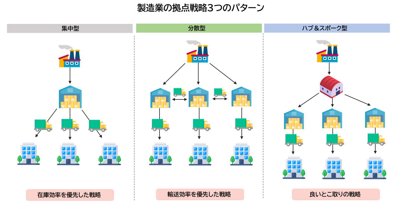 物流拠点戦略は、在庫効率と配送効率のバランスで決まります。それぞれの特徴を理解し、自社の事業特性に適した戦略を選択することが重要です。