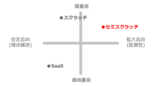 事業拡大や自社の独自性を追求していきたい場合は、拡張性に優れ、ベンダーロックインの回避に繋がるセミスクラッチ型、内製が有効です。