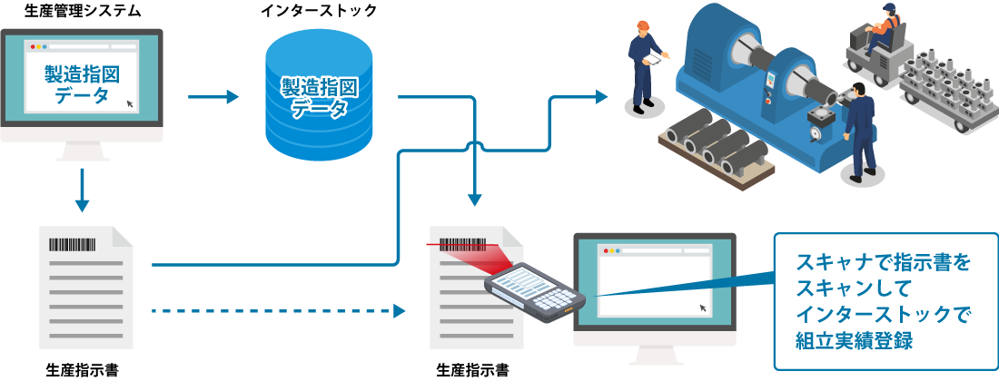 組立管理が求められる加工組立製造業特有の在庫管理に役立つ、組立実績登録機能です。生産管理システムから製造指図データをインターストックが連携し、組立実績を登録することで、構成部品の在庫をマイナスし、製品の在庫をプラスにします。